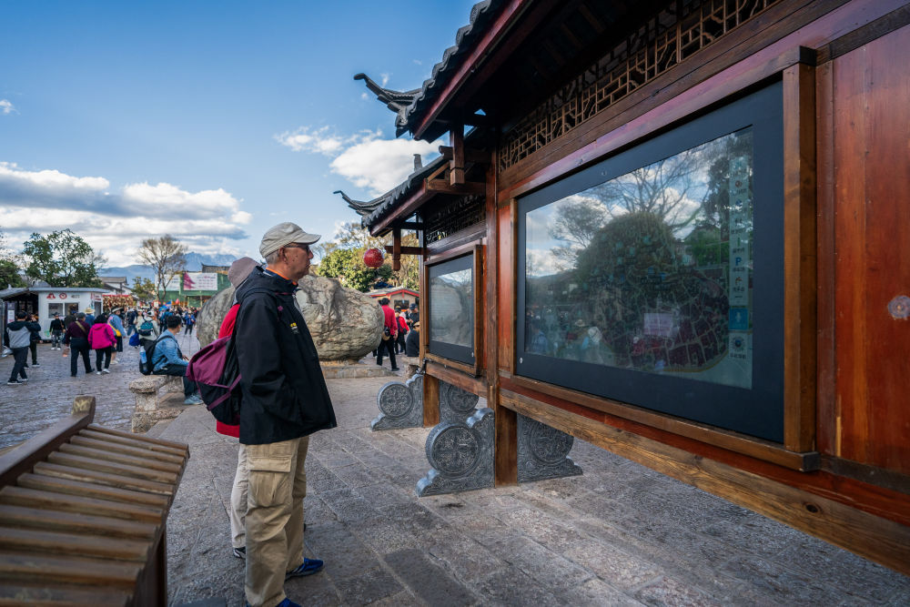 2024年3月23日,游客在麗江古城內(nèi)查看電子導覽大屏。云南省麗江市近年充分應(yīng)用5G、物聯(lián)網(wǎng)、大數(shù)據(jù)、人工智能等數(shù)字化技術(shù),大力推動智慧旅游發(fā)展,提升服務(wù)水平和游玩體驗,為當?shù)匚穆卯a(chǎn)業(yè)發(fā)展注入新活力。