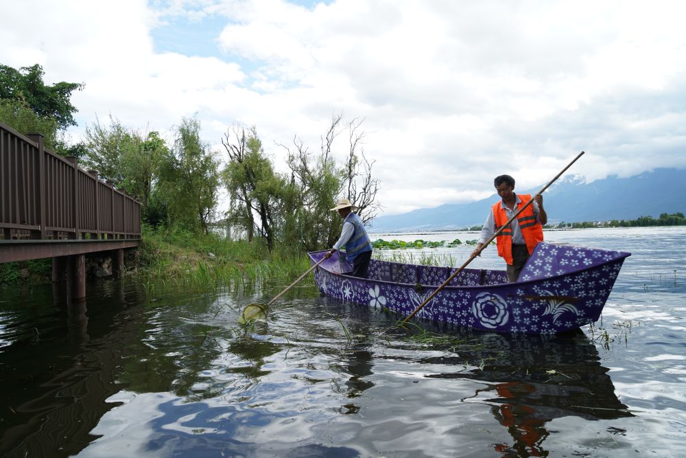 大理市灣橋鎮(zhèn)古生村位于洱海邊,是一個典型的白族傳統(tǒng)村落,已有1000多年歷史。近年來,當?shù)刈ゾo抓實洱海生態(tài)治理,古生村也因此受益,游客數(shù)量逐漸增加,當?shù)卮迕癯掷m(xù)增收。這是2020年9月14日,村民在大理市灣橋鎮(zhèn)古生村水域清理水草。