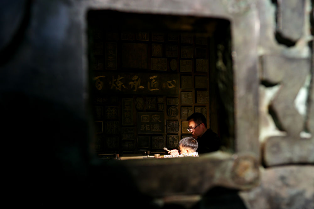 2026年3月25日,在云南曲靖會澤縣國家級非遺斑銅制作技藝傳習館,張氏斑銅第十三代傳人張偉在教兒子敲打銅器。會澤以“保護優(yōu)先、匠心修復、多元活化、融合共生”為路徑推進古城活化保護,對會館、民居等古建筑匠心修繕、活化利用,同時保留居民生活業(yè)態(tài),常態(tài)開展特色文化活動,用微改造提升古城環(huán)境。