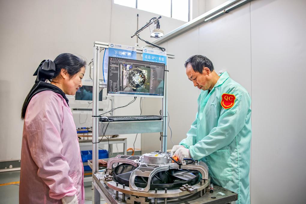 2026年4月2日,三江電器的工人正對電機產(chǎn)品進行下線檢查。(受訪者供圖)